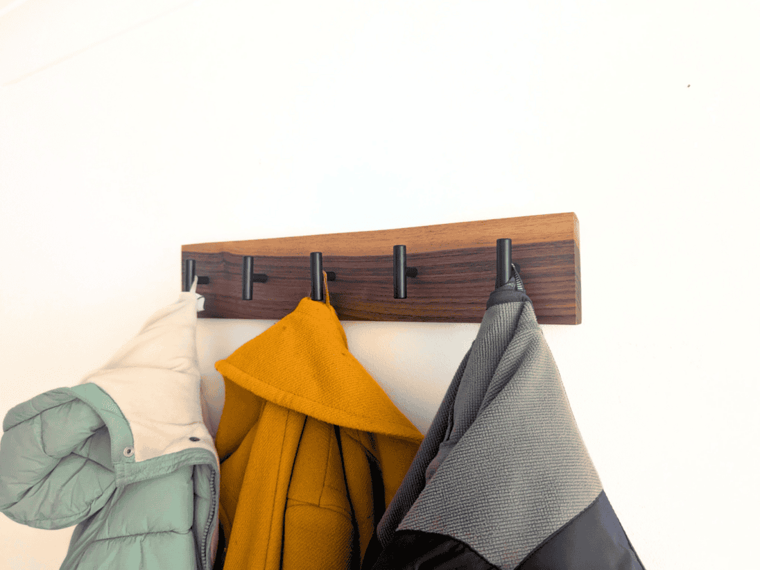 Our Modern Black Walnut coat Rack comes with a choice of 6 different hook colours to suit your taste and match your existing décor. The “T” style hooks are perfect for coats and scarfs, bags, hats, towels and even keys and provide a modern and unique alternative to the classic coat rack.
