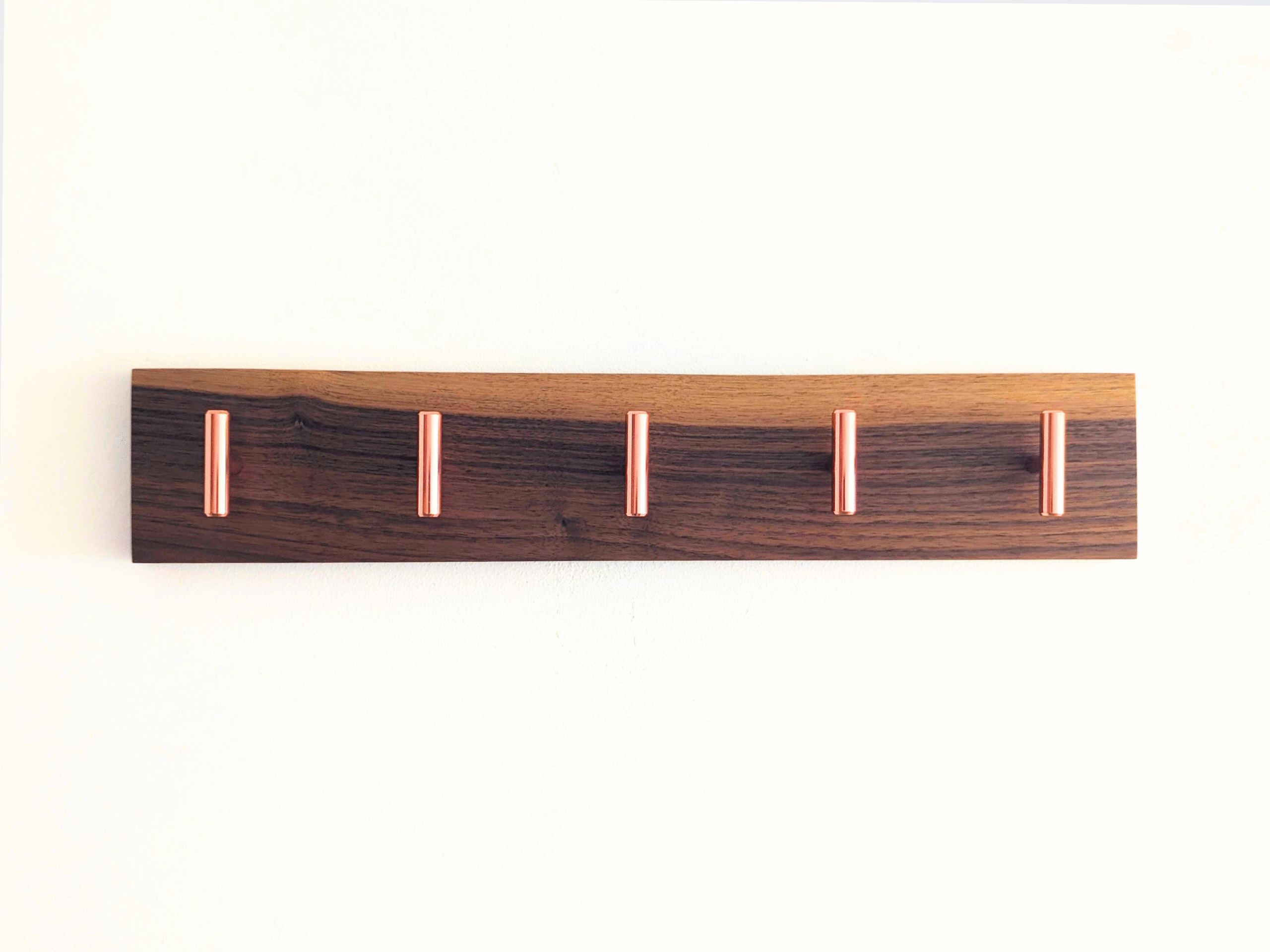 Each coat rack is customisable by length and number of hooks and with Black, Copper, Nickel, Chrome, Brushed Pewter and Rubbed Bronze hook types, there’s an option for everyone. Lovingly made to order in Yorkshire from solid Black Walnut, our coat racks are supplied complete with keyhole fixings on the rear for flush wall mounting and provide a minimalist and modern look for entranceways, bedrooms or bathrooms.