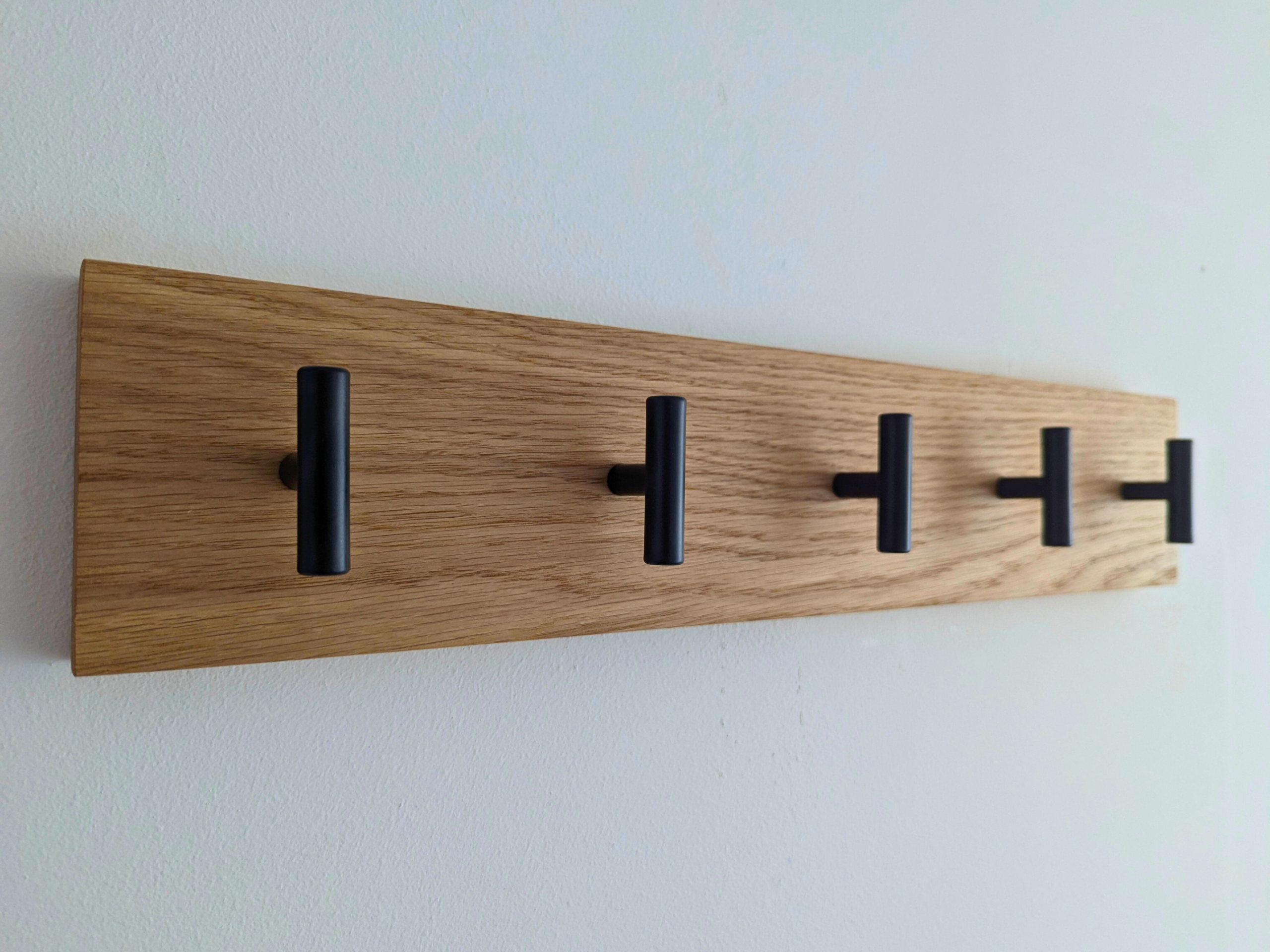 Our Modern Oak Coat Rack comes with a choice of 6 different hook colours to suit your taste and match your existing décor. The “T” style hooks are perfect for coats and scarfs, bags, hats, towels and even keys and provide a modern and unique alternative to the classic Oak coat rack.