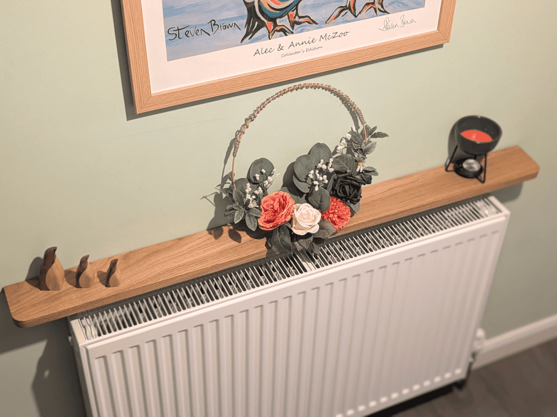 Despite being made from Kiln dried Oak with a low moisture content, all wooden products are prone to warping from temperature and humidity swings. To ensure this doesn’t result in warping of your shelf, lower the radiator temperature and slowly build this up over a couple of weeks to allow the shelf to acclimatise to the heat coming from the radiator.