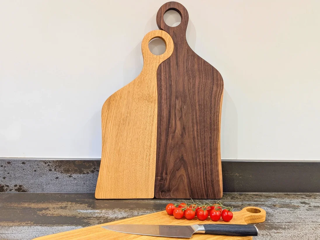 Our stunning Romeo & Juliet Chopping Boards are handmade in Yorkshire from the highest quality solid Oak and Black Walnut and are perfect for using as a chopping board in the kitchen with it’s all natural, non-toxic and food safe finish, or as a Charcuterie board/serving boards for serving up your favourite dishes and wowing your guests. Our solid Oak and Black Walnut boards provide the perfect centrepiece for your dining experience.