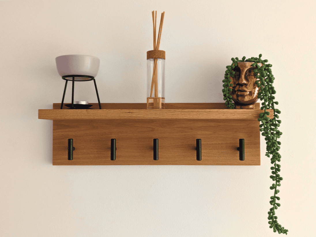 Our Solid Oak Coat Rack with shelf comes with a choice of 5 different hook colours to suit your taste and match your existing décor. The “T” style hooks are perfect for coats and scarfs, hats, towels and even keys.