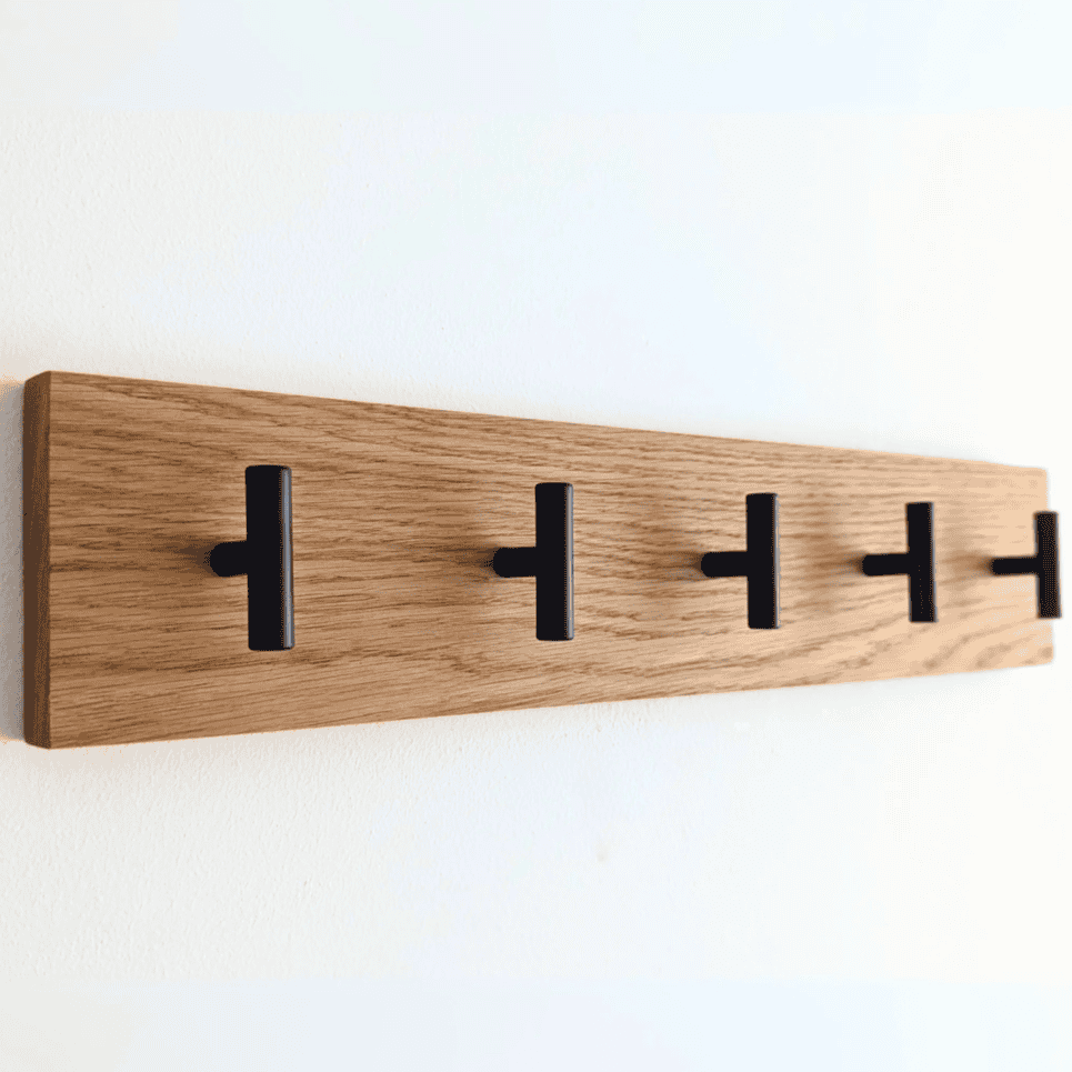 Our solid Oak and Black Walnut coat peg rack with it's solid Oak Backboard and Black Walnut pegs offers a minimal and clean, Scandi inspired design for a modern take on the classic Oak coat rack.